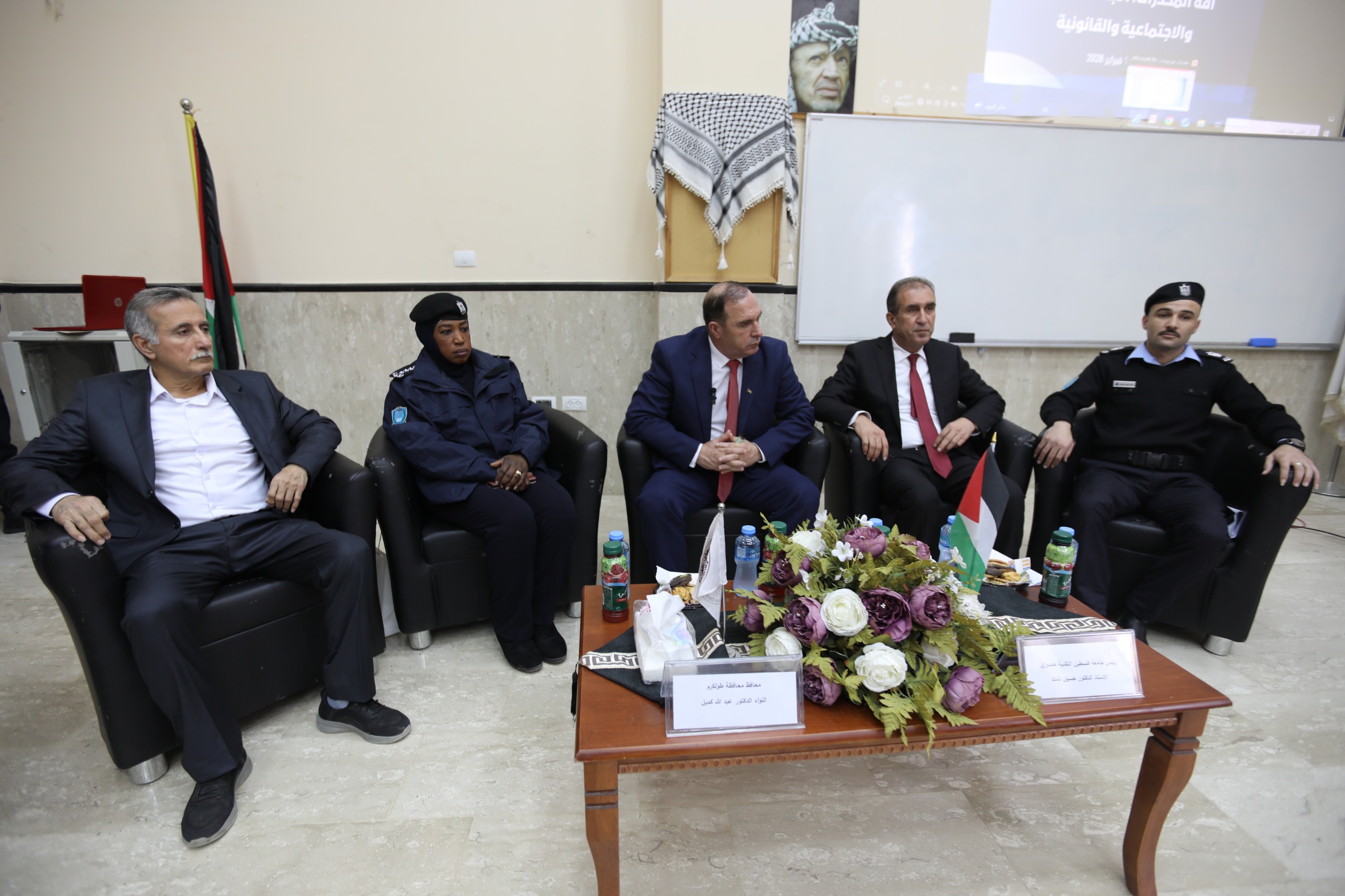 Palestine Technical University–Kadoorie (PTUK) hosted a study day titled “Drug Abuse: Health, Social, and Legal Dimensions,” under the patronage of Tulkarm Governor Major General Dr. Abdullah Kamil. The event was organized in partnership with the Palestinian Police (Anti-Narcotics Department) and the Community Protection from Drugs Association, with broad participation from official, academic, and community institutions, as well as students.